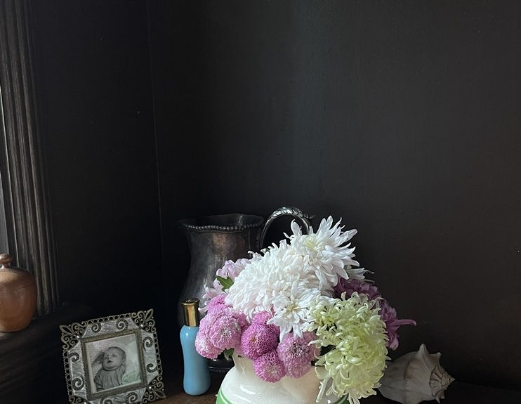 I create still life photographs in The Brown Wall Series using flowers and plant material gathered primarily from my garden in West Seattle’s High Point neighborhood. I arrange the blooms within a confined 2x2 or 2x3 corner formed by the brown walls of my home office, working with natural light from a south-facing window. I photograph each composition at three exposures and limit post-production to cropping and the removal of incidental distractions.