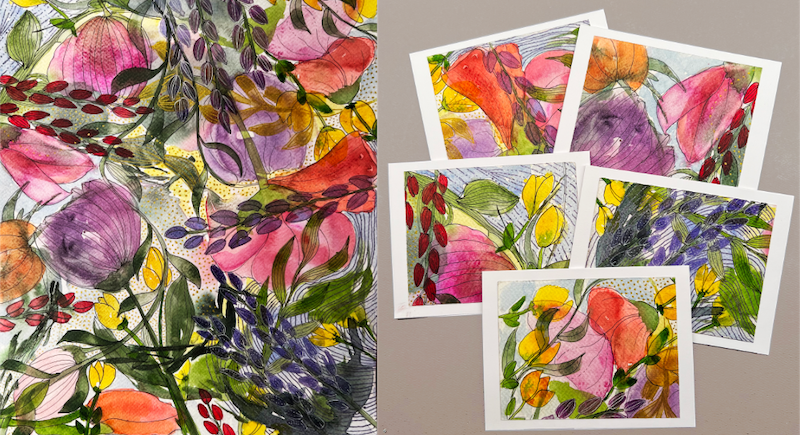 I am currently working with watercolor for its fluid and sometimes unpredictable nature – it suits the loose, whimsical, slightly abstracted floral themed work I create. Over the last six years I have honed my floral representations to reflect that style and I have turned many of the smaller works into note/art cards.